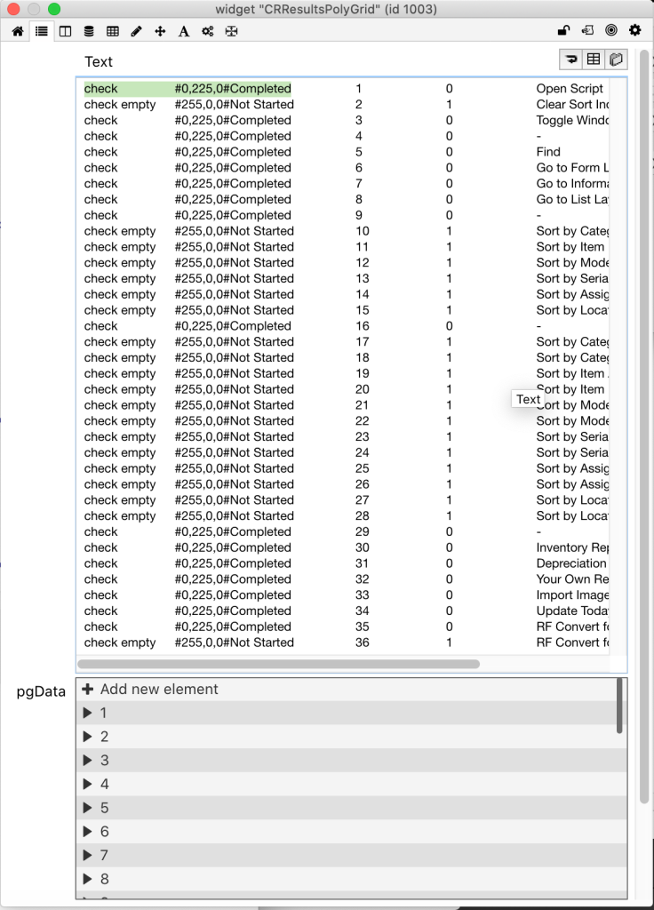 set the pgTextofCell of widget "CRResultsPolyGrid" to "#255,0,0#Not Started"