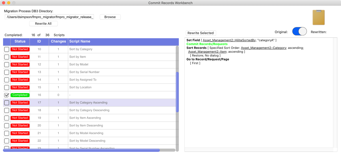 - Then they click the Rewrite All button. The text of the scripts will be read from the SQLite database and a summary of the results will be written into a new file named CRResults.JSON within the same directory.