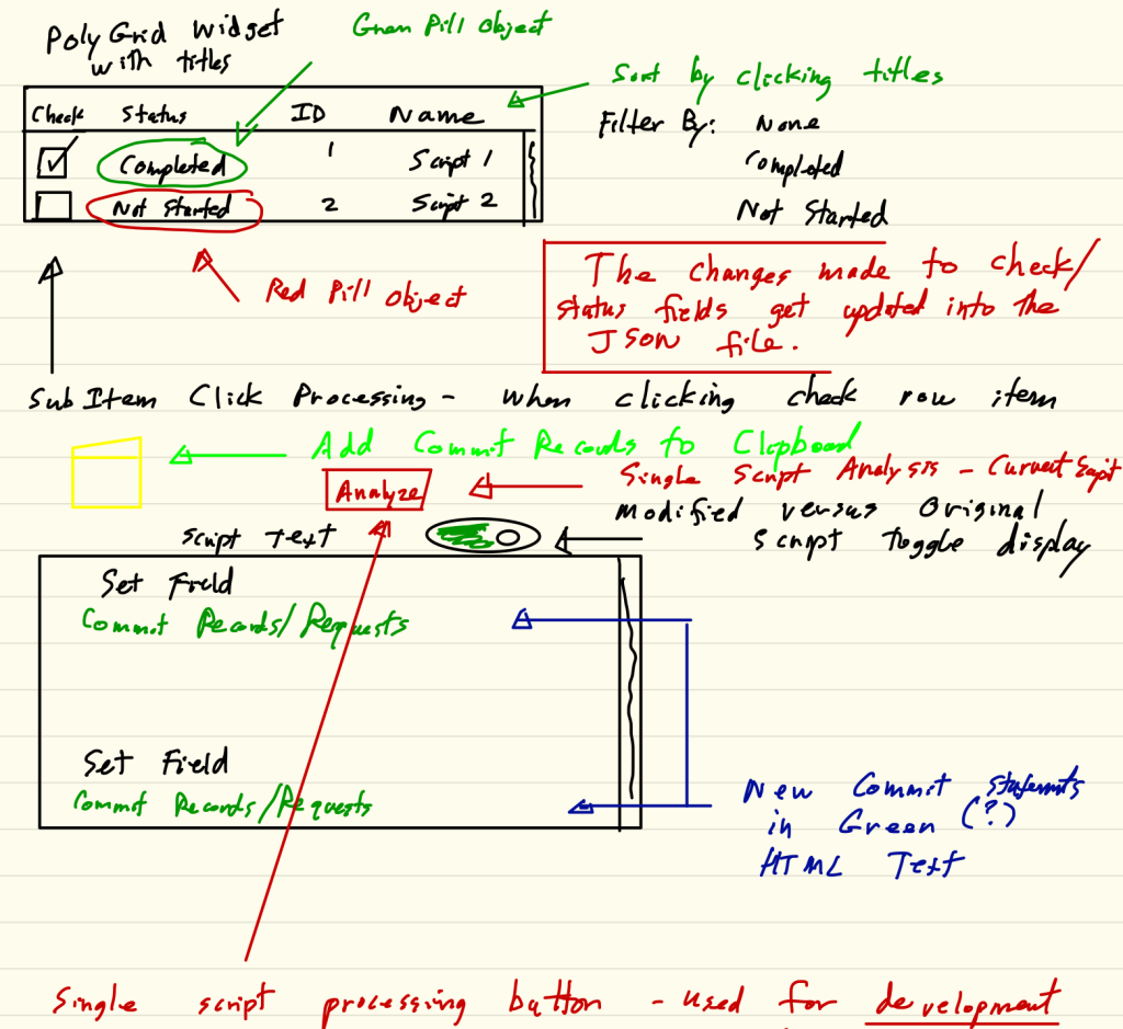 My design concept for this tool is to give the user a “Workbench” for making the changes to potentially hundreds of scripts or more within an individual database file. As the user makes their changes, they click the checkmark column of a PolyGrid row, which updates the status to “Completed” in addition to adding the checkmark. Clicking again, will “undo” the status value, in case they clicked it by mistake.
