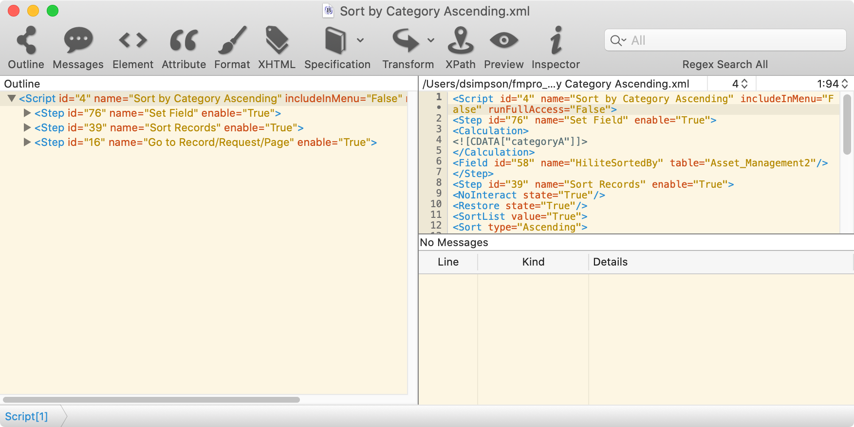 - I wasn’t certain that the revXMLText() function would render the XML exactly as FileMaker expects onto the clipboard. I have found situations in which FileMaker renders XML in a slightly different format than I had expected – so I have added a few workarounds in my code. Theoretically, this shouldn’t be a problem, but FileMaker uses the Xerces XML parser, and LiveCode uses libXML so there might be some differences. I didn’t want to get part of the way thru thousands of scripts and find unexpected problems.