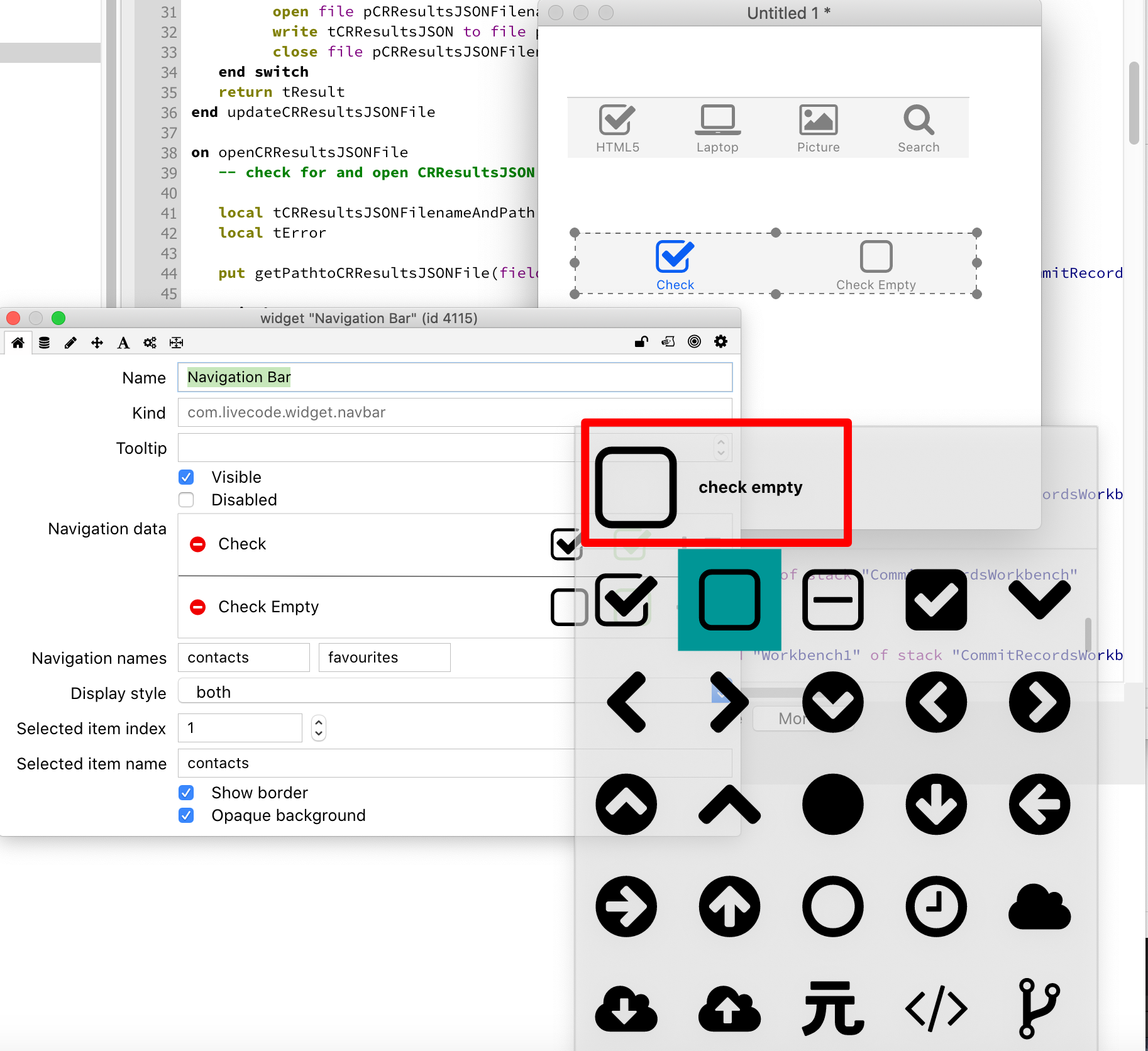 If you temporarily place a LiveCode Navigation Bar widget onto a card, you can select SVG icons for the buttons and see the names of the icons. If you click an icon after having selected it – its name will be displayed at the top of the selector panel as shown in this screenshot.