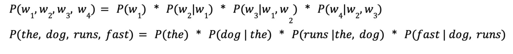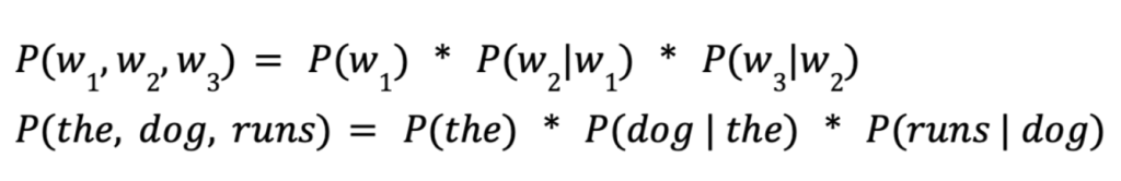 To put that in words, the probability of our phrase “the dog runs” is equal to the product of the probability of “the”, the probability of the word “dog” appearing directly after “the”, and the probability of “runs” coming after “dog”. The probability of each word is only considered relative to the word directly before it.