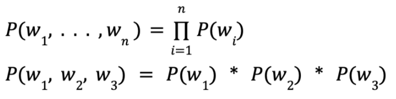 What this says is that for a unigram model the probability of our phrase w1 w2 w3 (let’s say “the dog runs”) is the same as the sum of the probabilities of each individual word appearing.