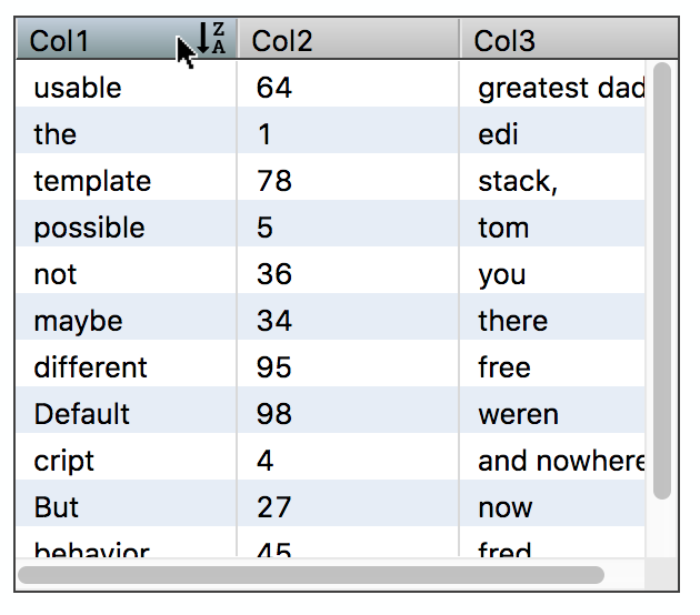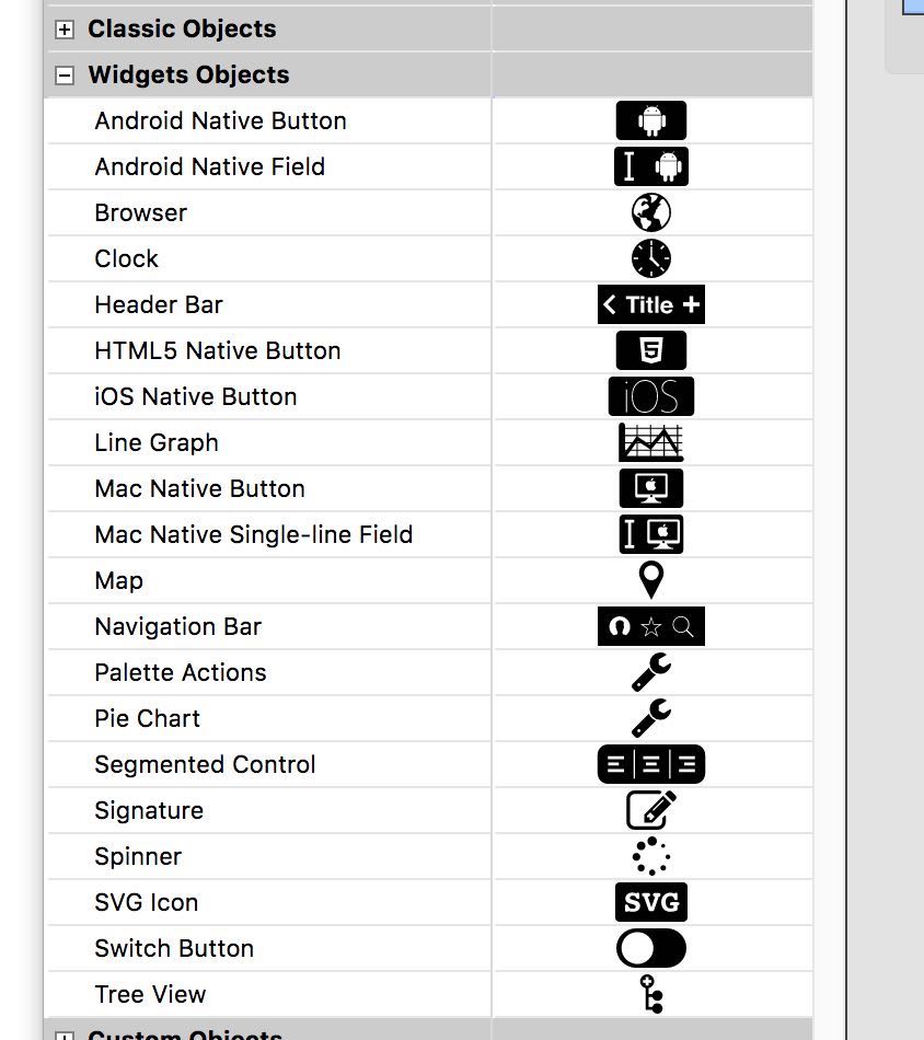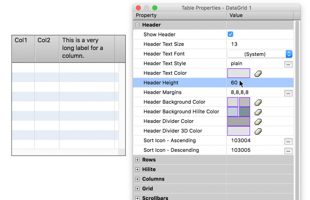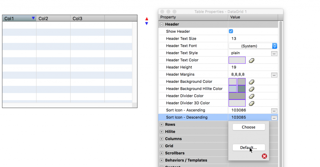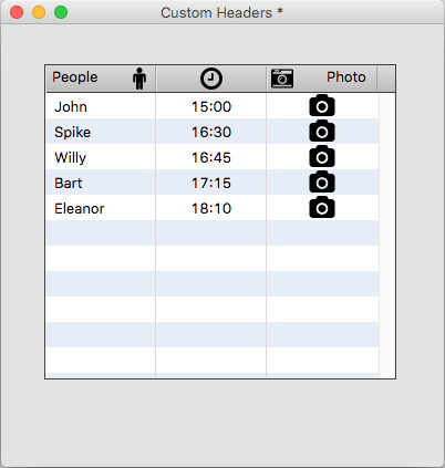 Now possible to customize the data grid table headers with controls (image, svg widget, checkbox), including the use of a svg icon for replacing the sort icons.