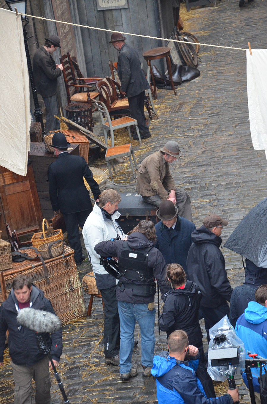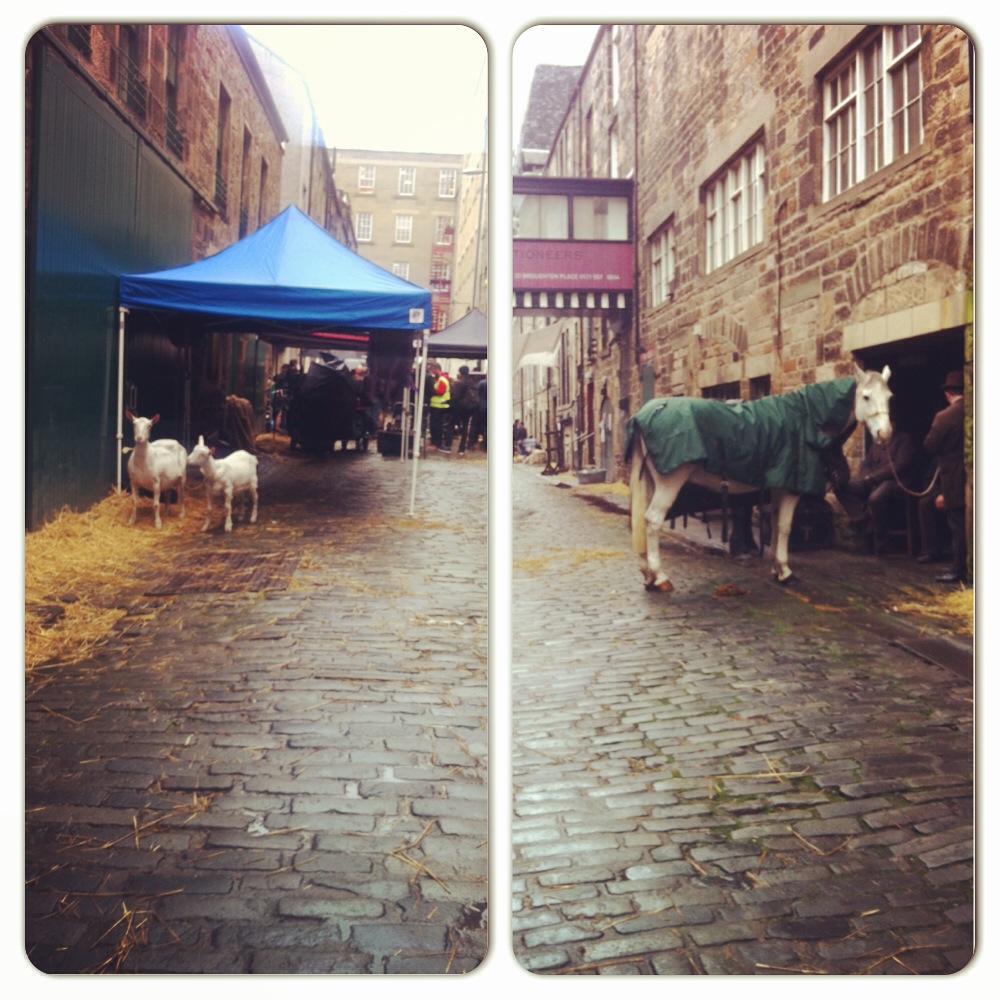 Edinburgh. Raining. The whinny of a horse blares through the window, as numerous bowler hats and long skirts walk past. We hear “Action,” more whinnies, and then “CUT!”