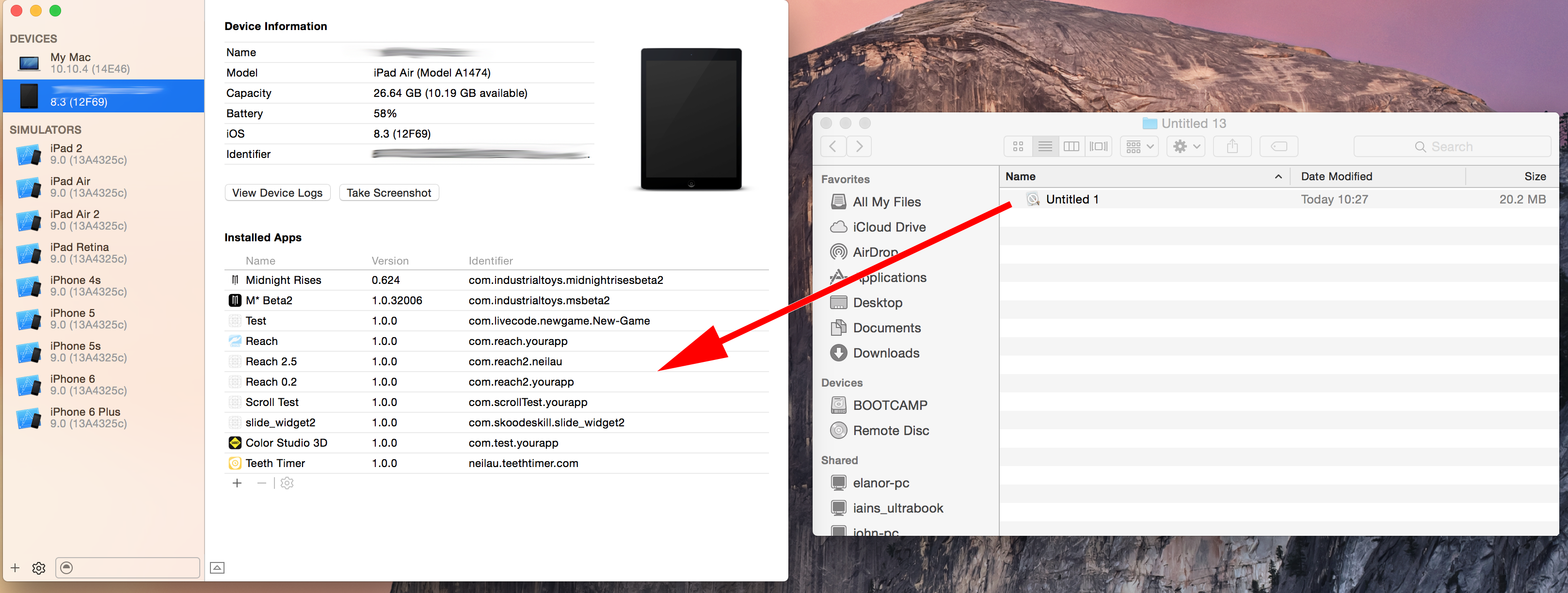 Step 12: Now that you have a standalone, you will want to get it onto your device. To do this, open Xcode and navigate to “Window—>Devices.” You should be presented with a window that displays your connected devices. To install your standalone, simply drag it from its build directory into the “Installed Apps” window of your device. See below: