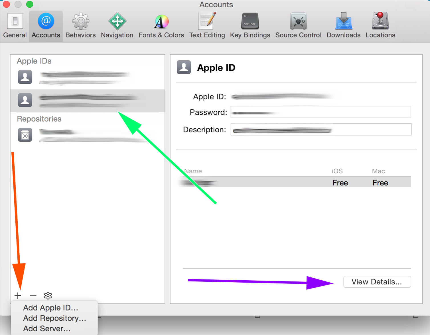 Step 3: From within Xcode 7, navigate to “Xcode—->Preferences—->Accounts.” Press the “+” icon (red arrow below) to add the Apple ID you created in Step 1.
