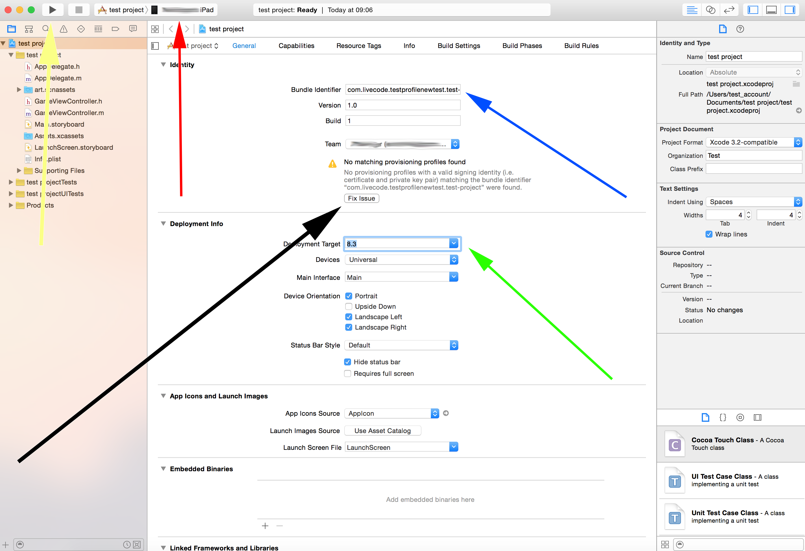 - Ensure the deployment target matches or is lower than your connect iOS device (green arrow above).
