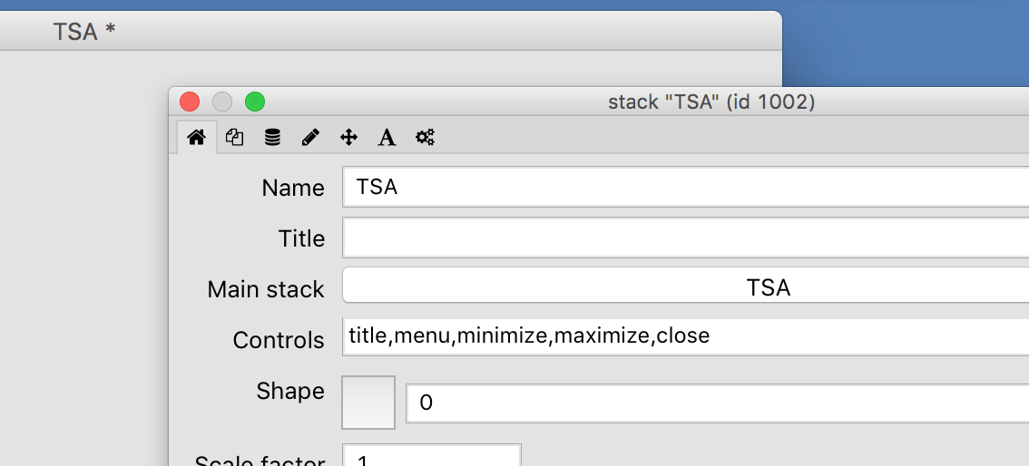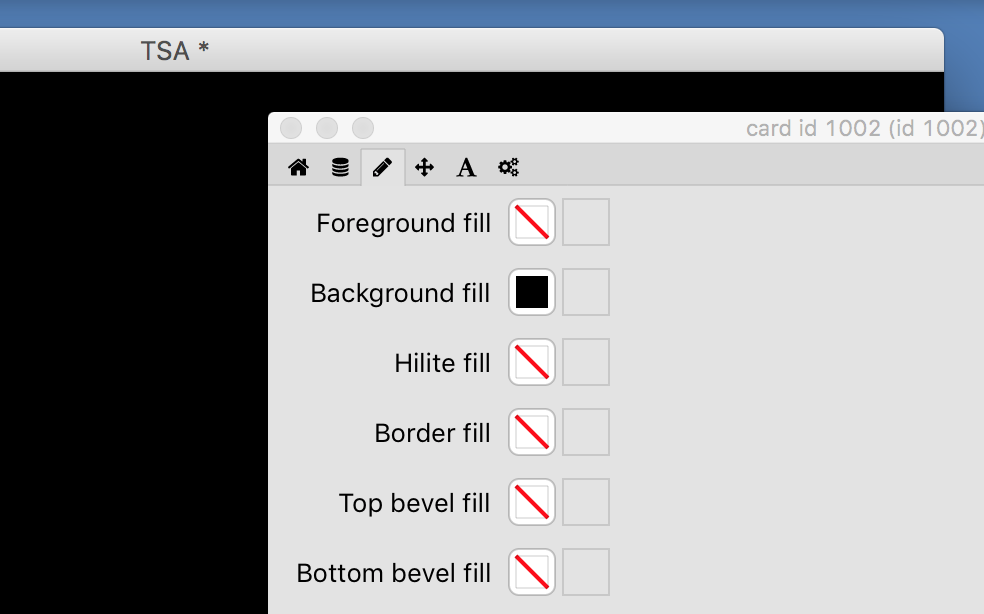After creating the initial stack, I give it the name TSA and change its background color to black via the property inspector. This is good point to also save the stack.