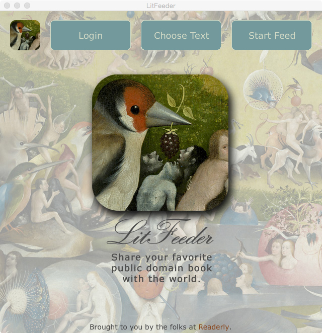 I realized in order to be taken seriously as an artist and critic, I needed to do app art myself. I came up with an idea to build an app that lets you automatically tweet your favorite public domain book out into the world one sentence at a time: every half hour. I call it LitFeeder. I started by building a beta version for Mac and Windows. I’m now working on a mobile version that uses LiveCode server. I’m also simultaneously using LitFeeder to tweet M.G. Lewis’s classic Gothic novel, The Monk, out into the world.