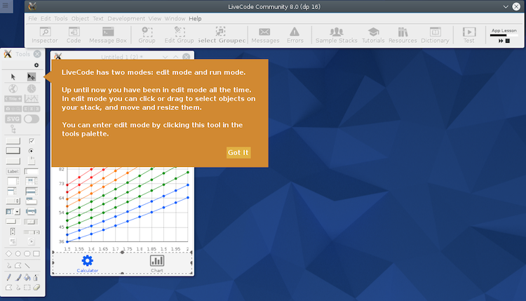The new “Interactive Welcome” steps a new user through the creation of a mobile app for checking and displaying Body Mass Index. Â It teaches you how to use stacks and cards, how to use widgets to create a user interface, and how to create scripts to tie them together.