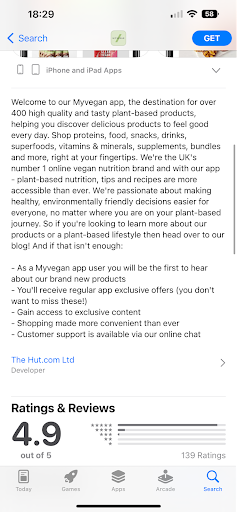If we look at the 15th app in the list(Myvegan) we can see what could be improved. This app has “vegan” and “recipe” in its title, which is a good start. It also has 139 ratings with an average of 4.9 out of 5. However, its description could use some work. It’s a wall of text that doesn’t make the reader want to continue. More importantly, the app doesn’t use the keyword “vegan recipes” in its description, even though this is the app’s main feature (it’s even in the title!). By including the keyword “vegan recipes” a few times in the description and making it more visually appealing, this app could improve its ranking in the search results for this keyword and drive a lot more organic traffic.
