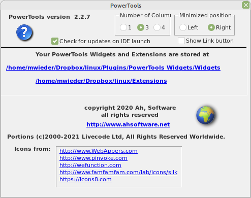 Now place the stack in your PowerTools widgets folder. You can navigate to the “PowerToolsWidgets/Widgets” folder and copy the stack in there, but an easier way to install it is to open the About Box and drop the newly-saved stack onto the center. See where the underlined text has the long path to “…/PowerTools Widgets/Widgets”?