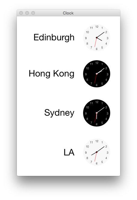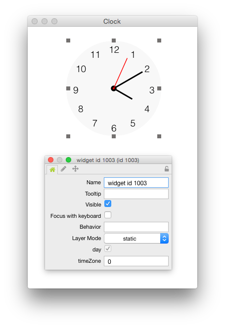 This widget consists of an analogue clock. The clock has day and night style displays which are used depending on the time. The period interpreted as day by the clock is controlled by a pair of constants kStartDay and kEndDay, currently set at 6 and 20 respectively. Thus the clock will display in night style between the hours of 8pm and 6am. The only settable property implemented by this clock widget is the timeZone, an integer which adjusts the time displayed relative to universal time (UTC).