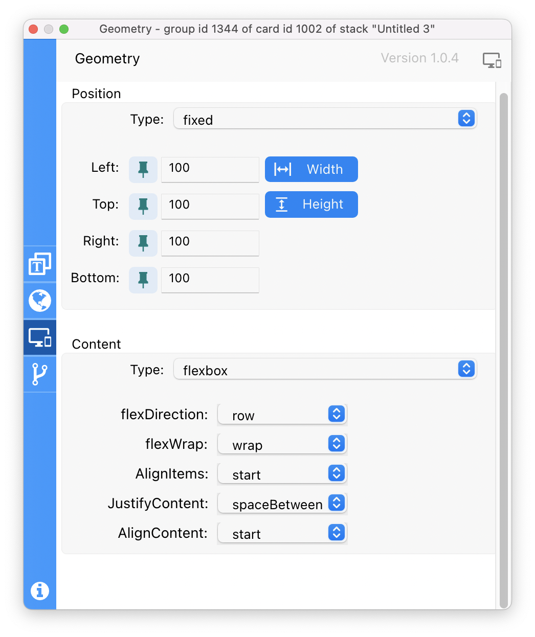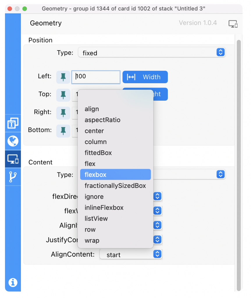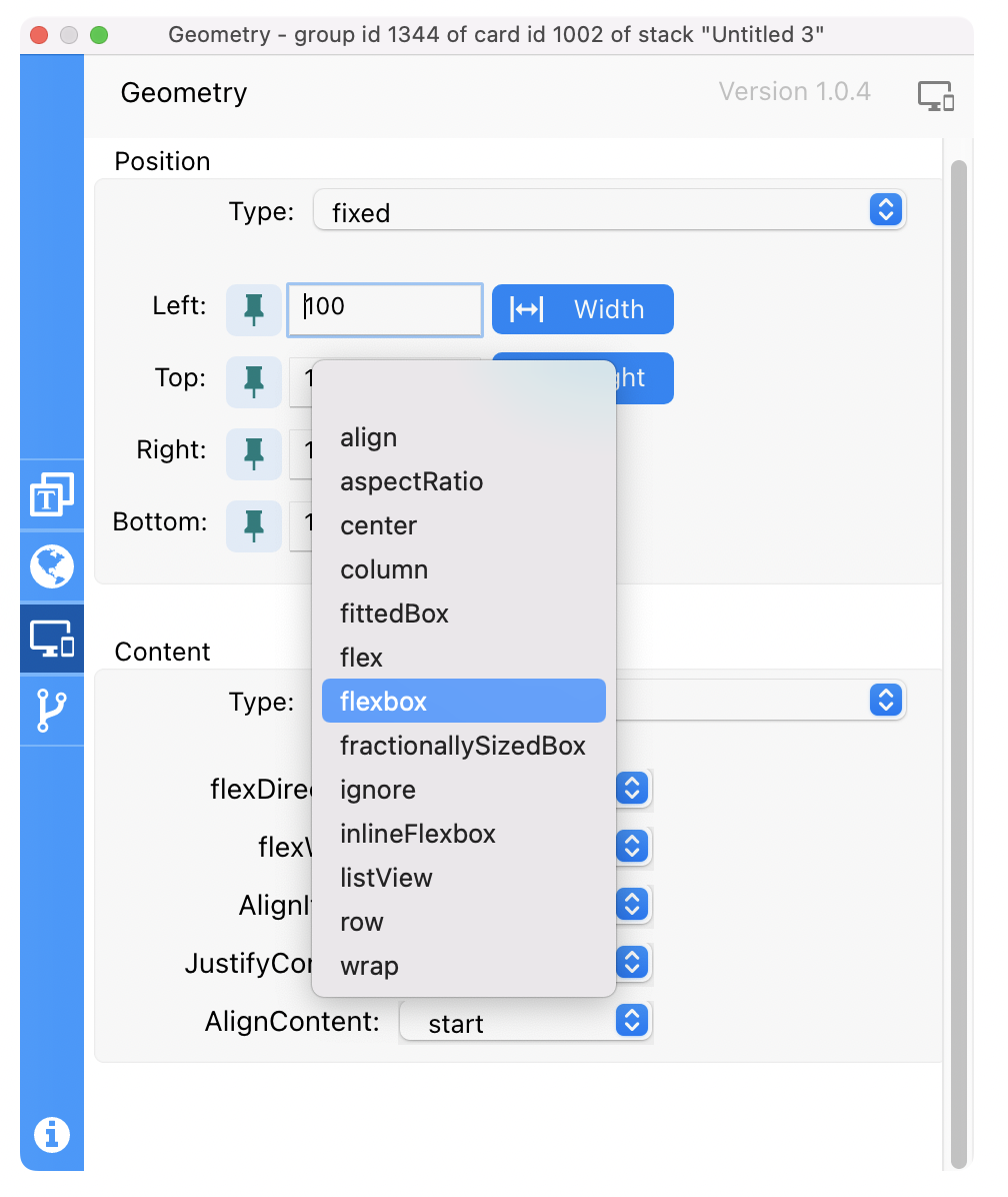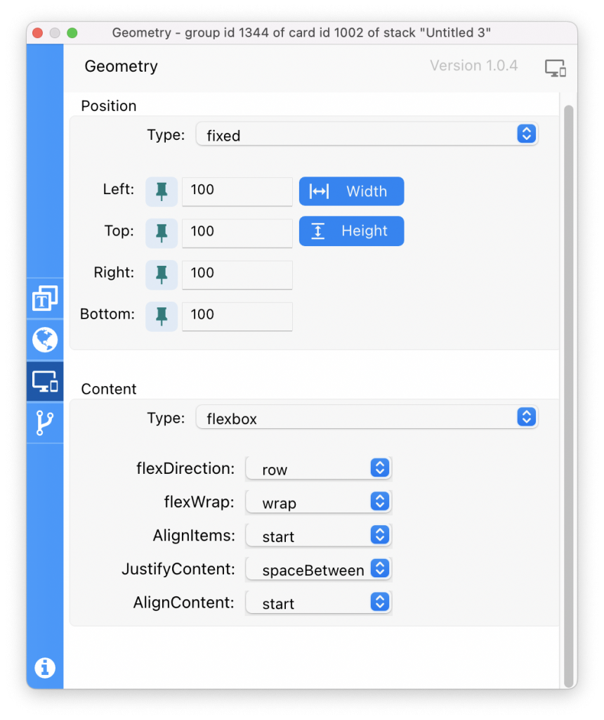 As you can see in the images above, Responsive Layout supports a full range of options, similar to those in CSS, including flexbox, list view, fitted box and more. Unlike the Geometry Manager, with these options you can for example make objects wrap within a group or card to create beautiful scrolling content areas as the window is resized. All of this can be applied to your project without any coding at all.