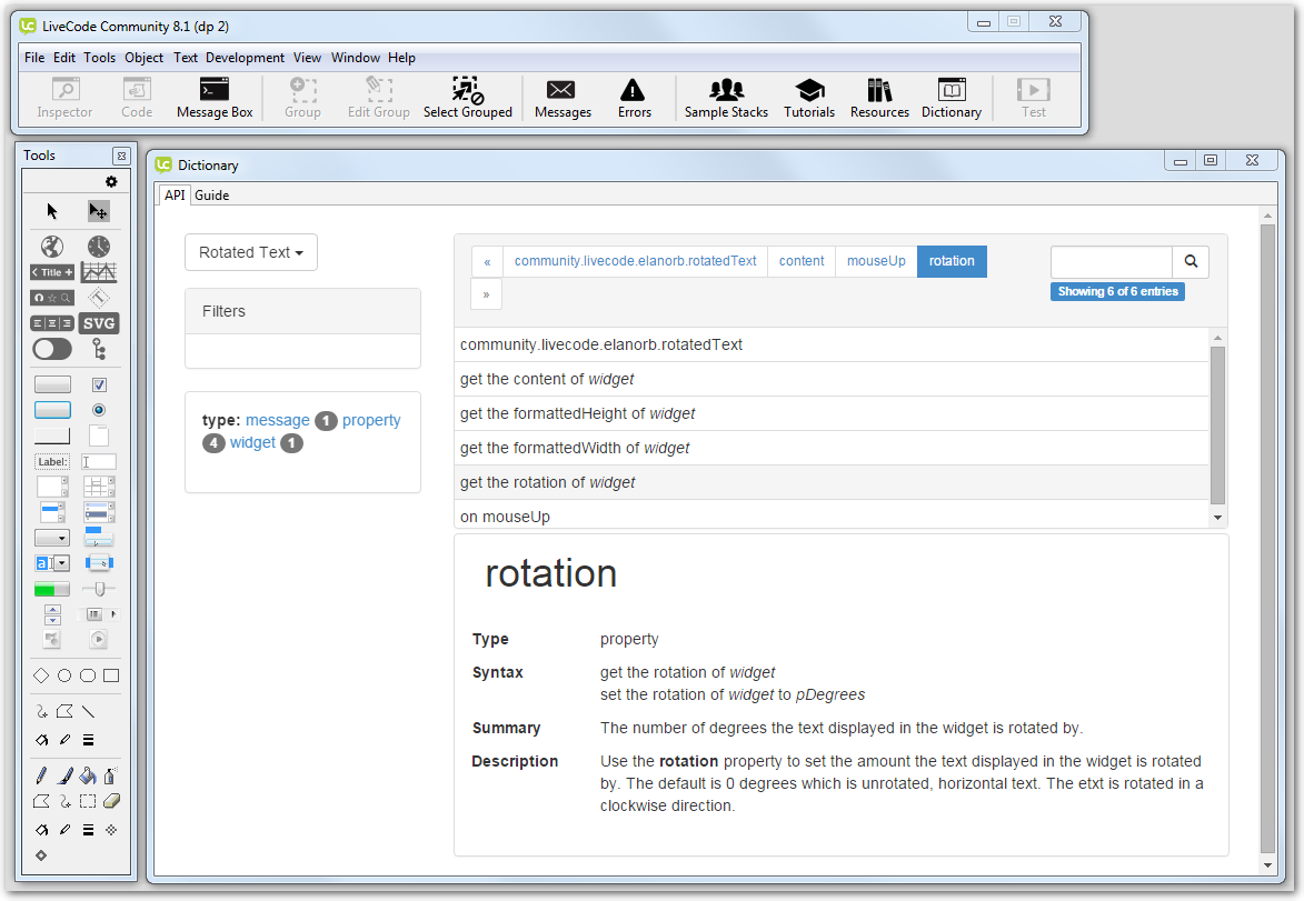 The documentation for the widget, message and properties will be shown in the Dictionary stack.