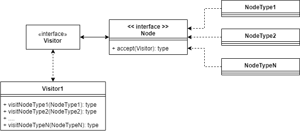 Typically speaking, in more “mainstream” programming language, the visitor pattern is achieved using something called “polymorphism”. Here, we leverage user-defined types in order to define both tree Nodes and Visitors as classes and using a back-and-forth mechanism known as double dispatch to achieve this. Schematically, this would look like this: